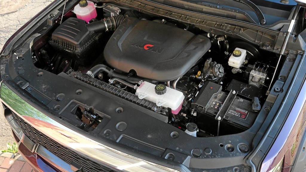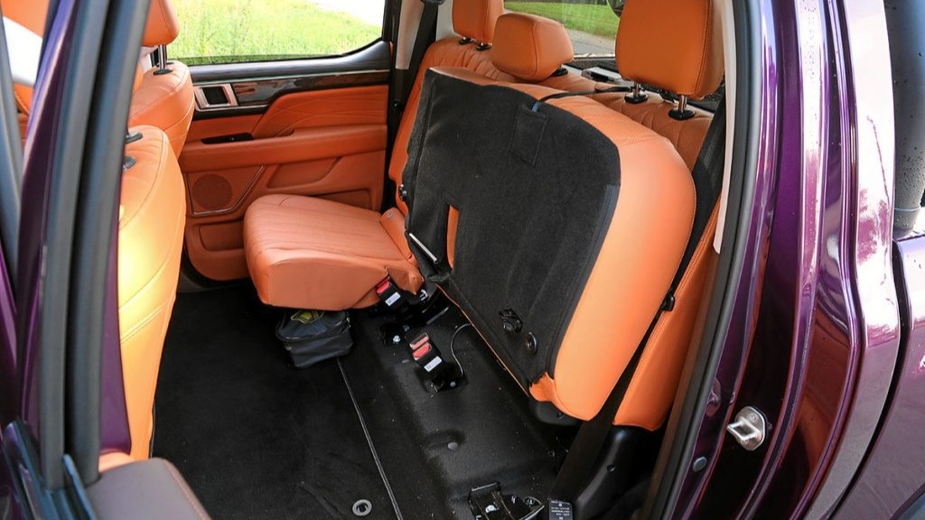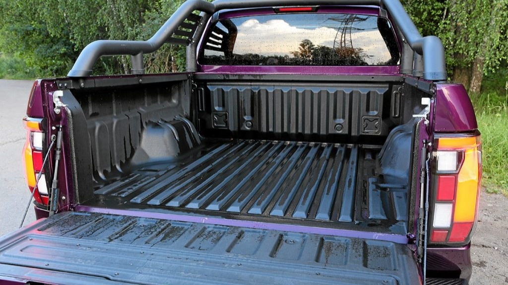 Конечно, о том, что это, прежде всего, грузовик, пусть и очень удобный, и почти роскошный, вы все же вспомните, хотя бы когда озаботитесь размещением багажа. Места для него найдется только в кузове, потому что за откидной спинкой дивана свободного пространства кот наплакал — там закреплен домкрат и установлен еще один аккумулятор. Ведь силовой агрегат Tunland V9 представляет собой так называемый «мягкий гибрид» с 48‑вольтовым стартер-генератором, который призван экономить топливо. Можно, конечно, разместить небольшие сумки под подушками дивана — они поднимаются по отдельности и фиксируются ремешком к спинке. Но если поставить сюда чемоданы, то пассажиров на второй ряд уже не посадишь.