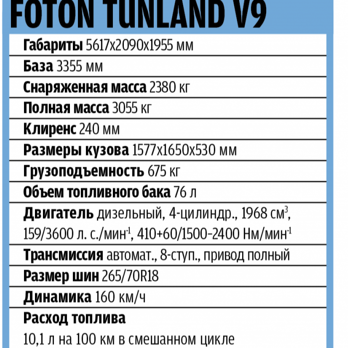 Самое первое впечатление от Foton Tunland V9 — он на удивление легкий на ходу. Мощность двухлитрового дизеля на бумаге невелика: всего-то 159 сил, но на практике дефицита не чувствуешь, разгоняется грузовик без напряга. Хотя тот же самый мотор с таким же 8‑ступенчатым автоматом ZF, установленный на BAIC BJ40, год назад показался мне на редкость меланхоличным. А за Tunland V9 нужен глаз да глаз — чуть зазеваешься, и скоростной лимит превышен не только в городе, но и на шоссе. Субъективные свои ощущения я не могу подтвердить цифрами — официальных данных разгона 9‑го «Тунланда» нет, но он явно резвее, чем BJ40 с его 14,8 с до сотни.