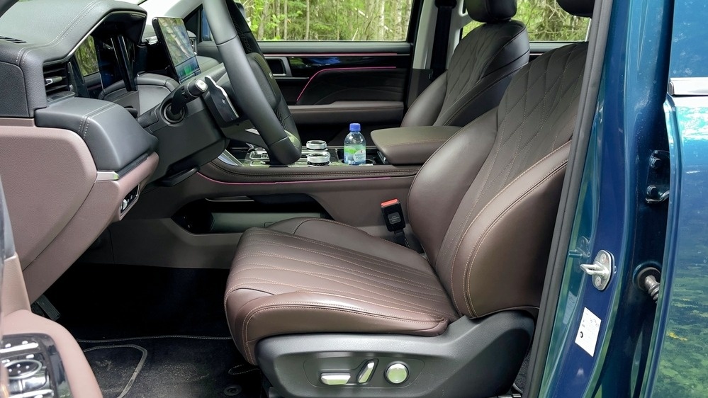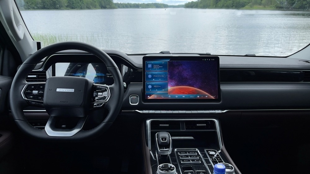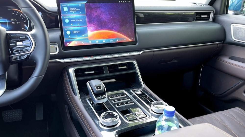 С завода установлены камеры кругового обзора, парктроники по кругу, система контроля давления в шинах, круиз-контроль, кнопка запуска двигателя и светодиодная оптика — причём светит она действительно хорошо. Предусмотрен обогрев лобового стекла. А вот обогрева руля пока нет, хотя в компании сообщили, что в будущих партиях он появится.