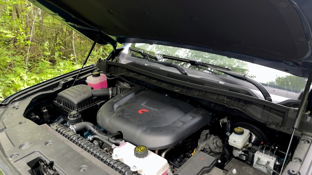 Под капотом Foton Tunland V7 — 2-литровый дизель семейства Aucan: 159 л.с. и 410 Нм при 1500–2400 об/мин. Двигатель работает ровно, без вибраций, с негромким, но узнаваемым звуком дизеля. Помогает стартер-генератор — 48-вольтовая система Bosch, встроенная в привод навесного оборудования. Она добавляет тягу на низах (до 60 Нм), пока турбина не вышла на рабочие обороты. Эту поддержку особенно чувствуешь при старте и в городском ритме. Работает всё в фоне, без участия водителя, и на панели приборов можно наблюдать процесс зарядки и рекуперации.