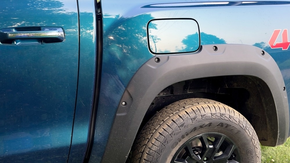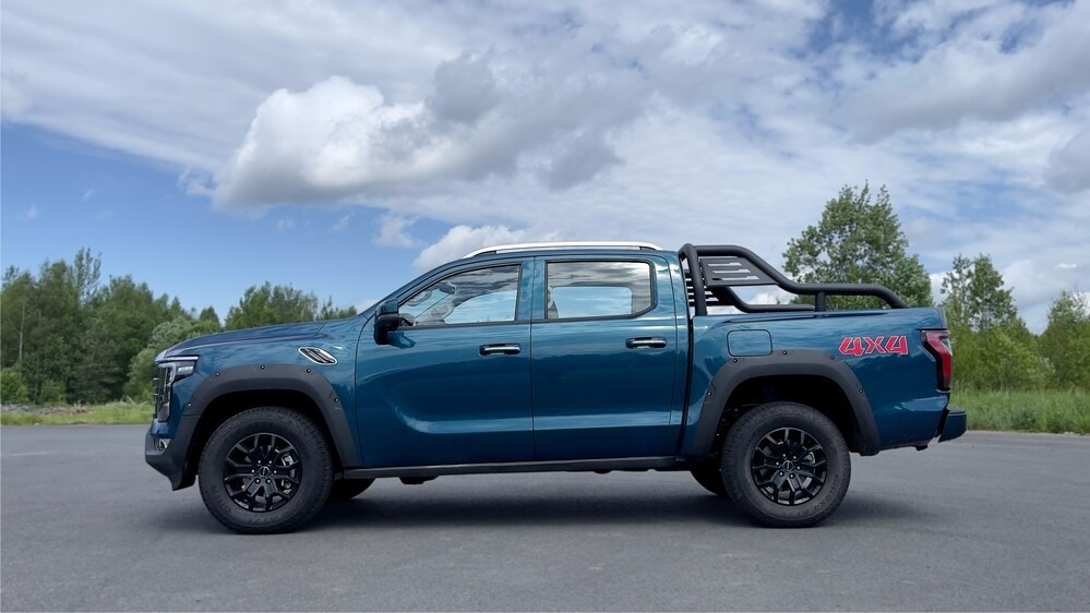 Но есть и визуальный трюк. Кузов тестовой машины был сине-зелёным с эффектом хамелеона. На солнце такой оттенок играет гранями – от цвета морской волны до глубокого синего, в тени превращается в тёмно-синий, а ночью — почти чёрный. На фоне утилитарных серых и белых пикапов машина сразу выделяется. Особенно эффектно смотрятся боковины: из-за выштамповок и бликов от краски пикап кажется ещё шире и выше, чем есть на самом деле.