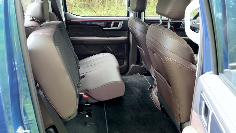 Задний ряд — с комфортной спинкой и подлокотником. Пространства достаточно, но посадка скорее вертикальная — в дальней дороге это ощущается. Подушка заднего сиденья складывается в пропорции 60/40, что позволяет перевозить крупные вещи в салоне.